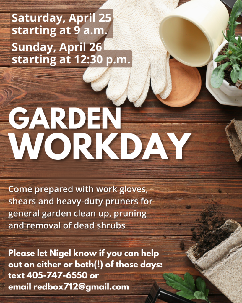 Come prepared with work gloves, shears and heavy-duty pruners for general garden clean up, pruning and removal of dead shrubs. Please let Nigel know if you can help.
